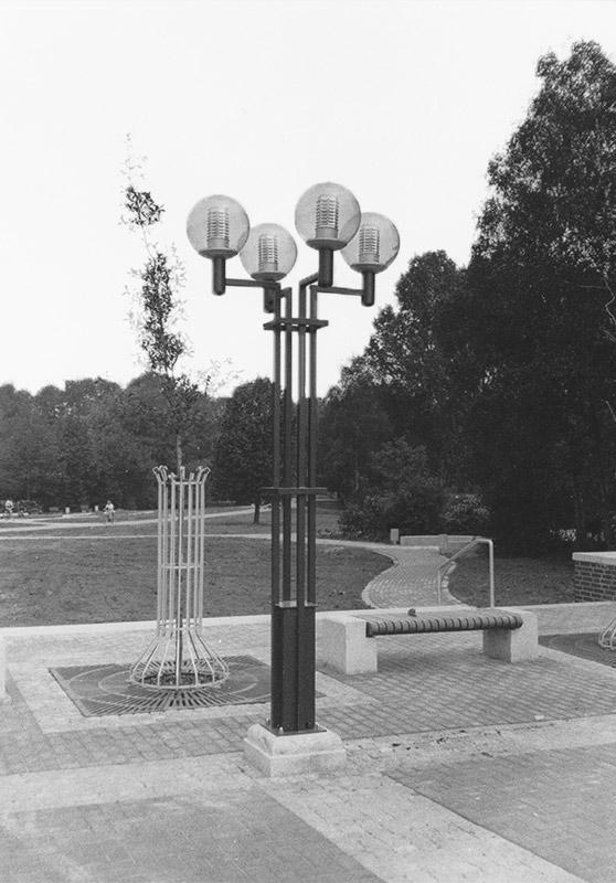 Wesentliche Gestaltungselemente sind die durchlaufenden Eichen-Baumreihen in Doppelstellung im Wechsel mit individuell gestalteten Leuchten und das durchlaufende Ziegelpflaster mit Granitbänderung.