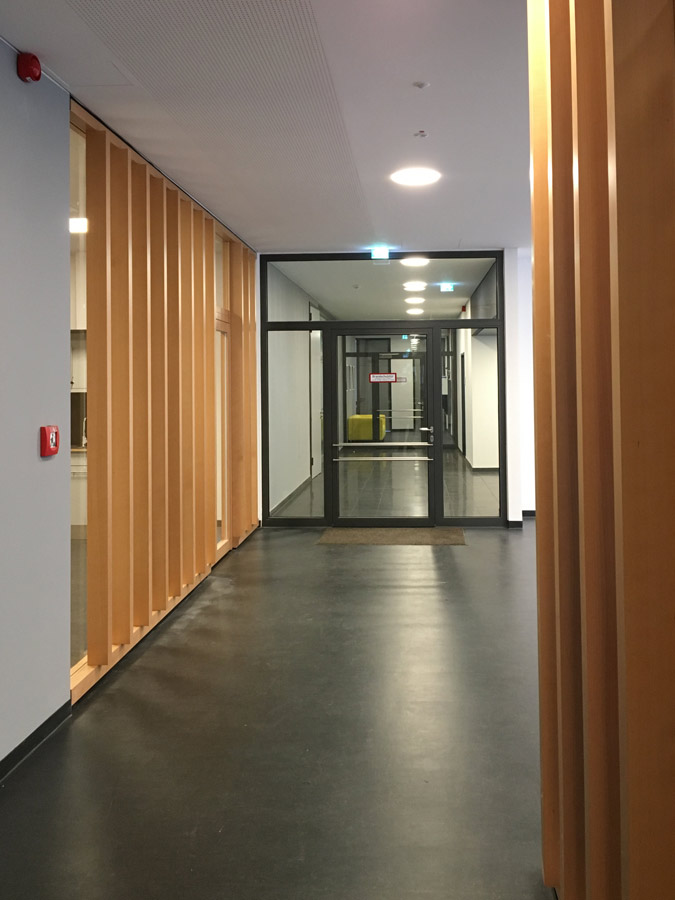 Die Grundrissstruktur EG – Dreibund mit zwei vertikalen Erschließungskernen und zwei verwinkelten Zugängen – wird grundsätzlich beibehalten. Der dreibündige Grundriss ist gegliedert in drei Nutzungseinheiten und einem Seminartrakt mit notwendigem Flur, sowie den vorhandenen Treppenhauskernen und Zugängen. Der hofseitige Bereich zwischen den beiden Zugängen soll als zentrale offene Aufenthaltszone allen Studierenden zur Verfügung stehen. Zwei transparent gestaltete Sozialräume sollen im Mittelbund die Anbindung des Seminarbereichs verbessern.