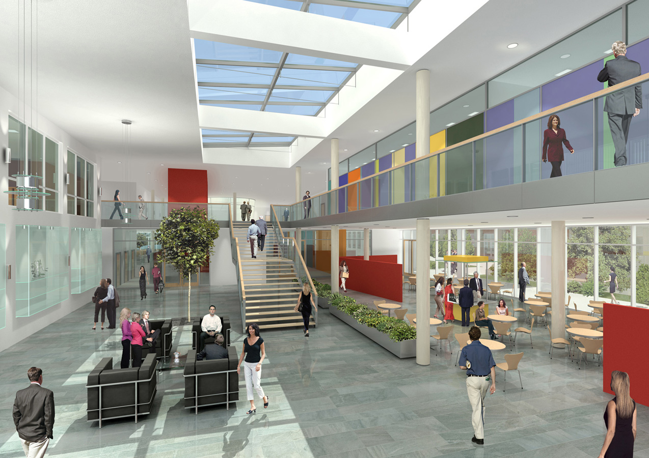 Die zentrale Halle dient als Orientierungspunkt mit Erschließung der Verwaltung im Hochhaus, der Konferenzräume und Kantine im Neubau sowie der Büros und Labore im alten Backsteinbau. Gleichzeitig ist die Halle „Erlebnisraum“ mit Cafeteria, Museum, Ausstellung und Versammlungsraum für 300 Mitarbeiter*innen.